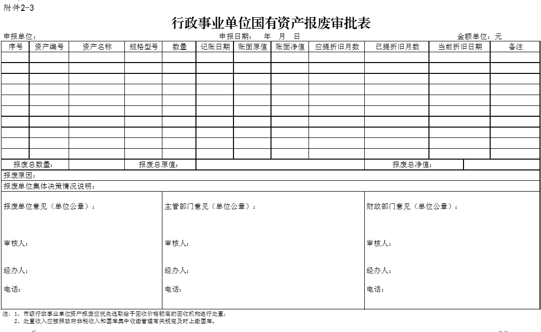 2.《行政事業(yè)單位國(guó)有資產(chǎn)報(bào)廢審批表》;