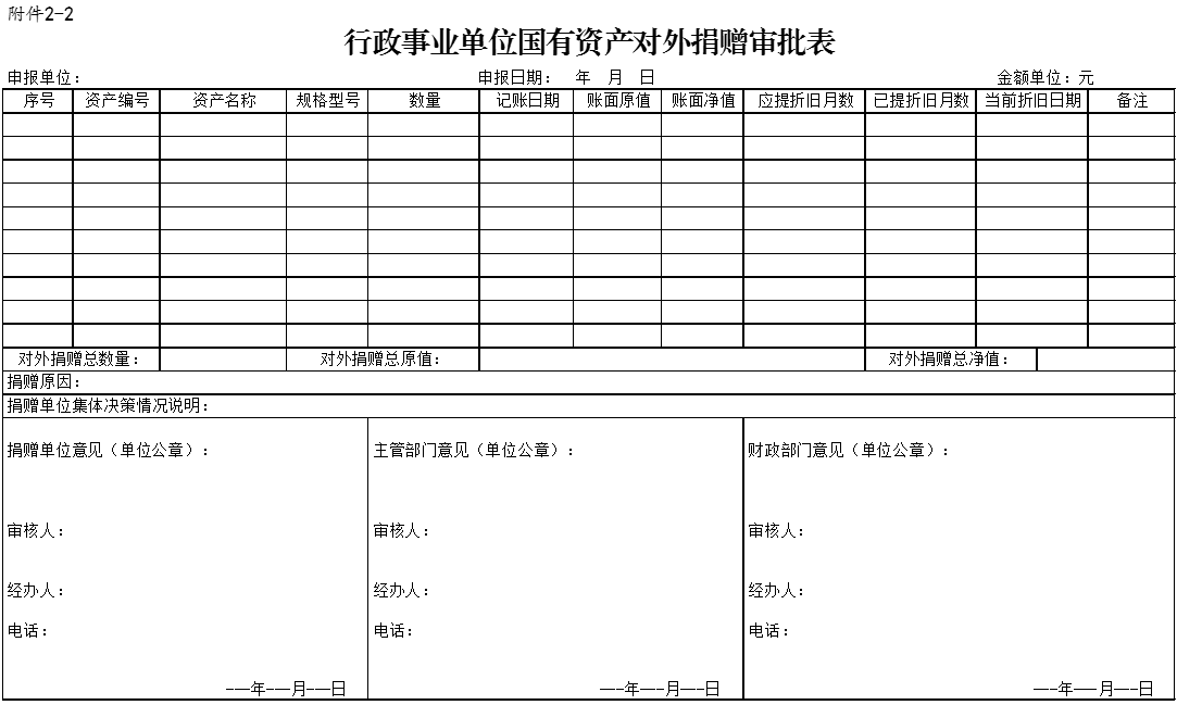 2.《行政事業(yè)單位國(guó)有資產(chǎn)對(duì)外捐贈(zèng)審批表》;